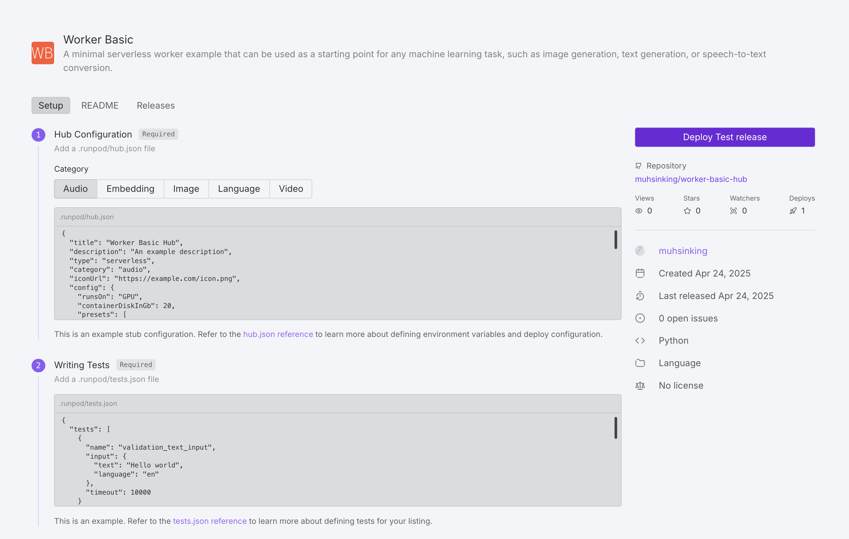 After all the necessary files are in place and a release has been created, your repo will be marked “Pending” during building/testing. After testing is complete, the Runpod team will manually review the repo for publication.
