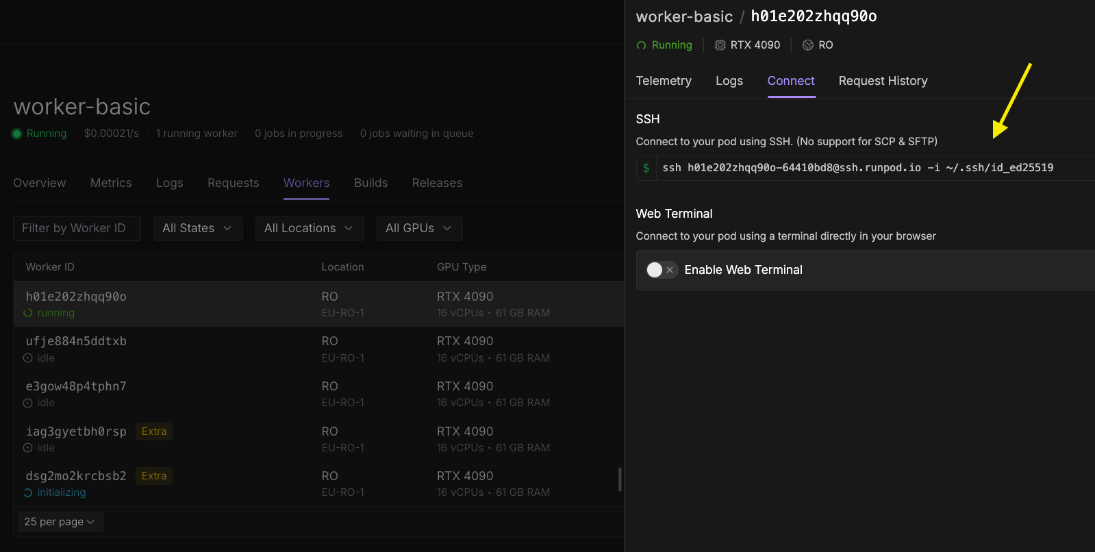 Select the Workers tab in your endpoint’s details page to view all running workers for this endpoint.Here you’ll see a list of all workers associated with your endpoint. Find a worker with a status of Running and click on it to open its detail pane.